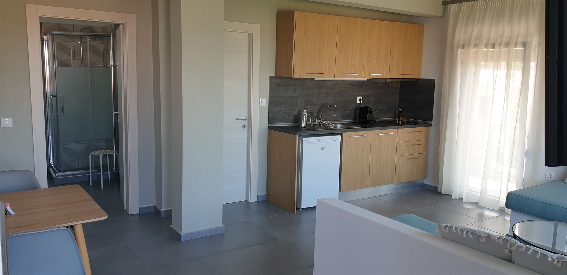 • μια ανοιχτή κουζίνα και ένα καθιστικό με δύο καναπέδες-κρεββάτια